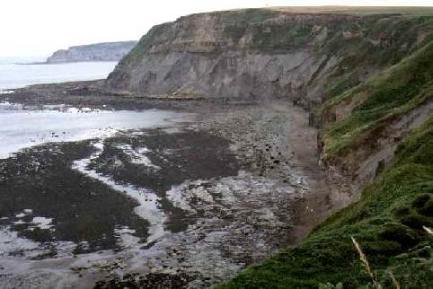 Mulgrave Shale and Alum Shale Members are exposed in the cliffs. Pieces of